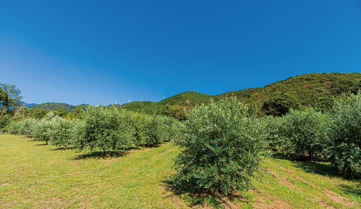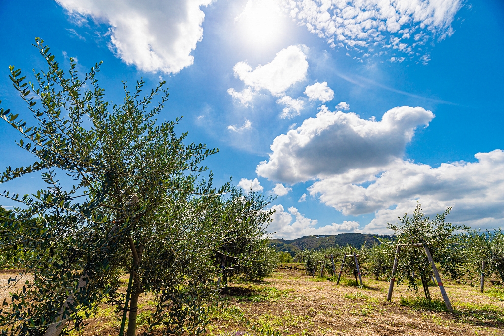現在、オリーブが育てられている圃場は、江戸時代から先人たちがみかん畑として使ってきた場所です。日当たりと水はけがよく、オリーブ栽培に適した気候に恵まれた場所です。オリーブ栽培には年間2,000時間の日照時間が必要ですが、これをクリアした畑にて栽培をしています。