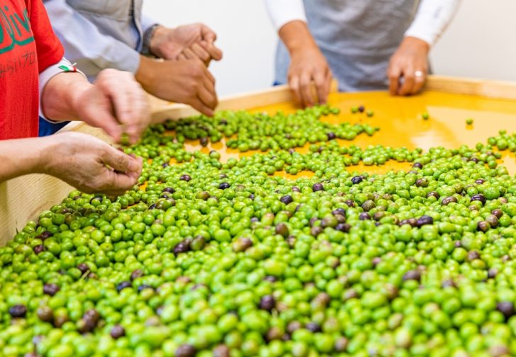 人の手で一つずつ丁寧に高品質のオリーブオイルをつくるためには、傷などの無い良質の実を選別することが大切です。この作業は機械では難しく、人の手で一つずつ丁寧に行う必要があります。この一手間を惜しまず、真剣に行うことが美味しいオリーブオイルを造るのにとても重要となります。