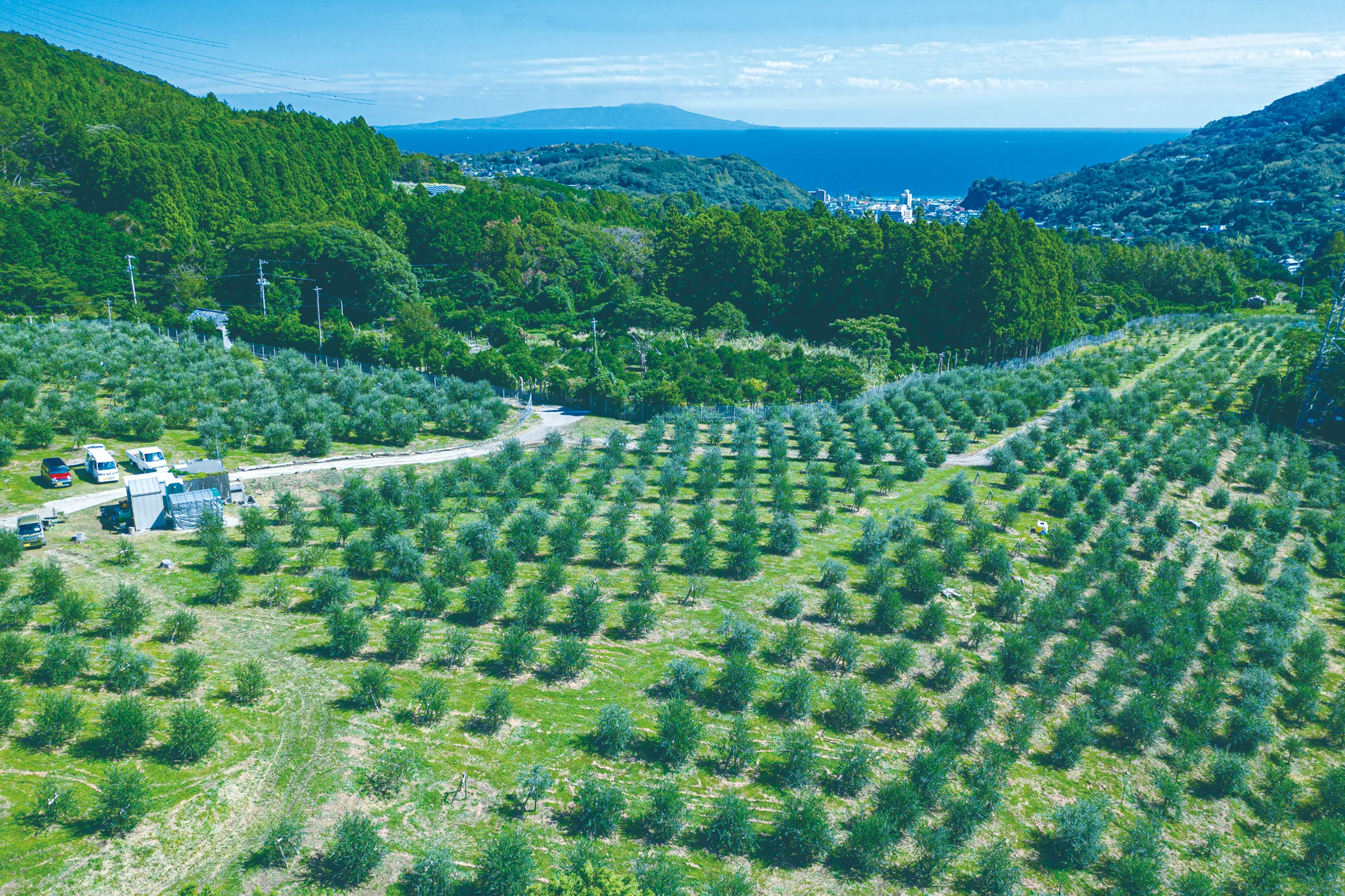 静岡県の東端から南へ60㎞突き出した伊豆半島。山地が大部分を占め、入り組んだ海岸に囲まれた複雑な地形は、地域ごとに多様な風土を形成しています。その独特な成り立ちと地質遺産をもつ大地はユネスコの『ジオパーク』に認定されています。日本有数の多雨地帯ながら、温暖で日照時間にも恵まれた気候のもと、伊豆半島東部でオリーブを栽培しています。