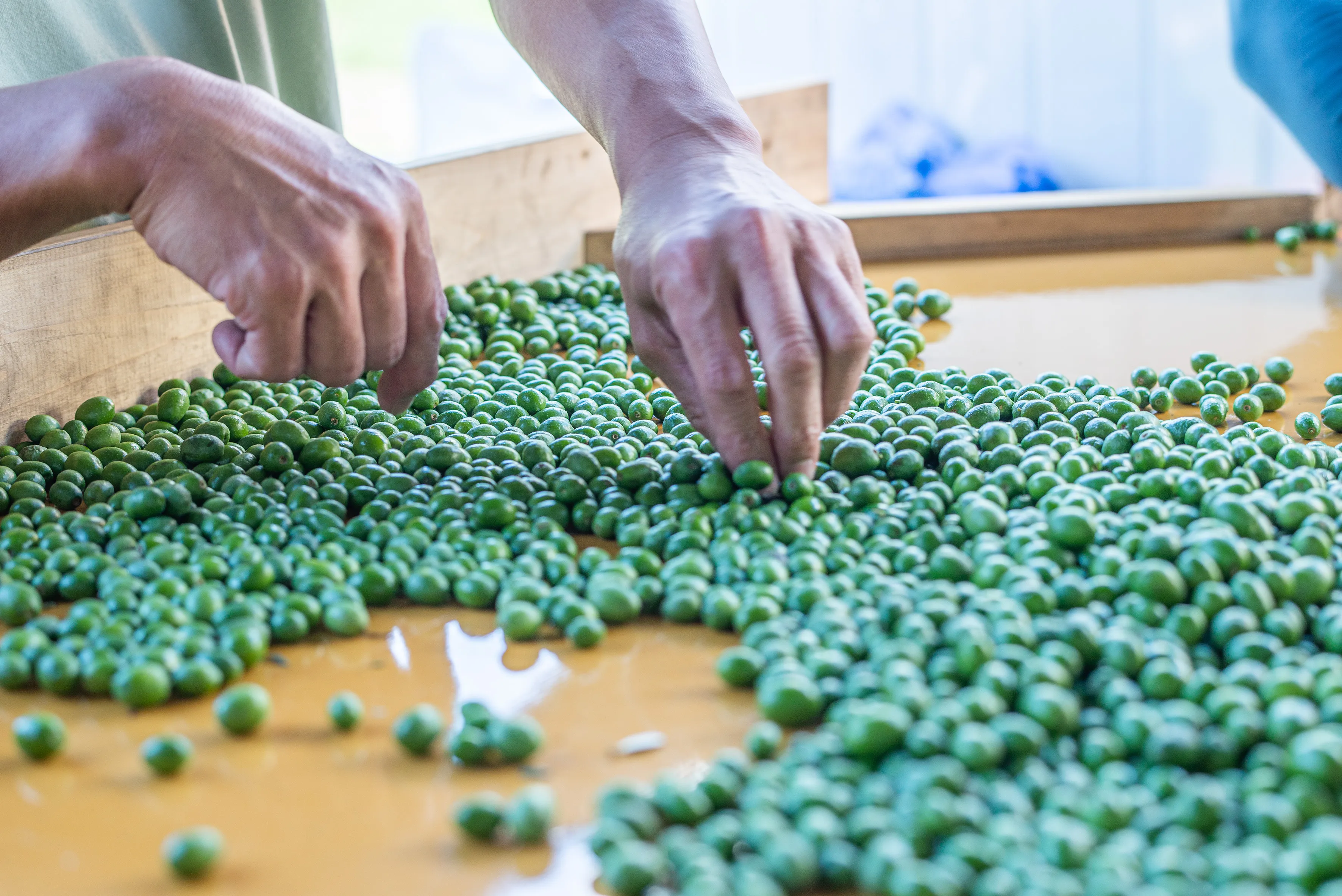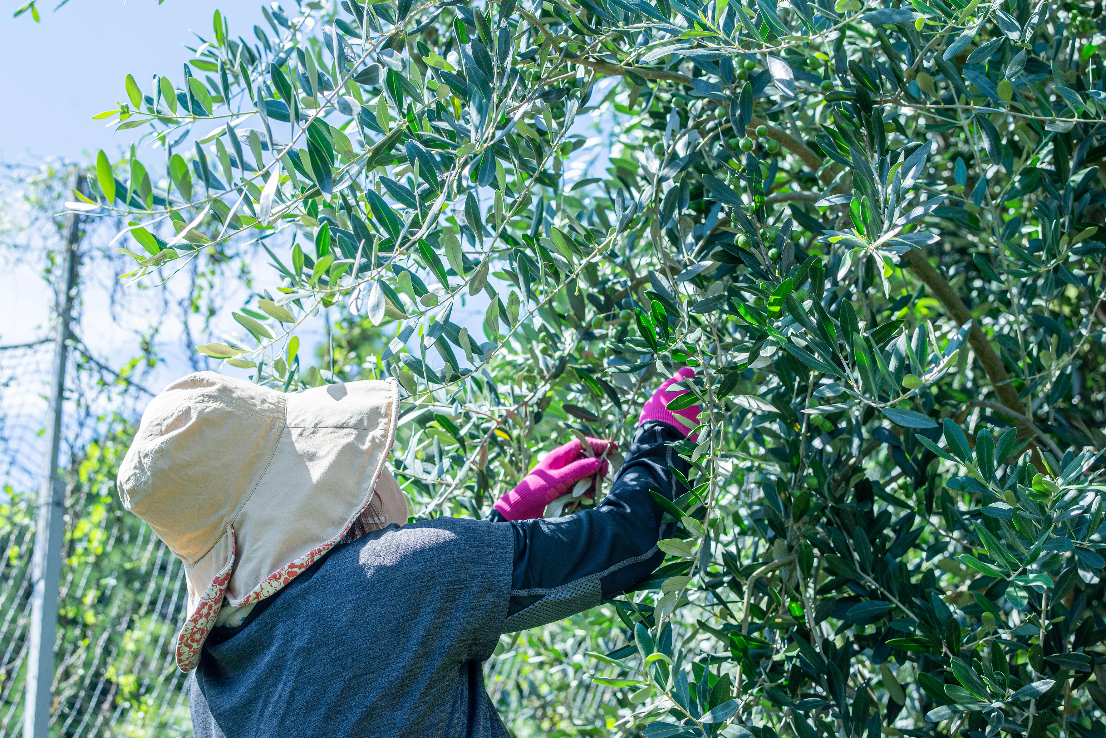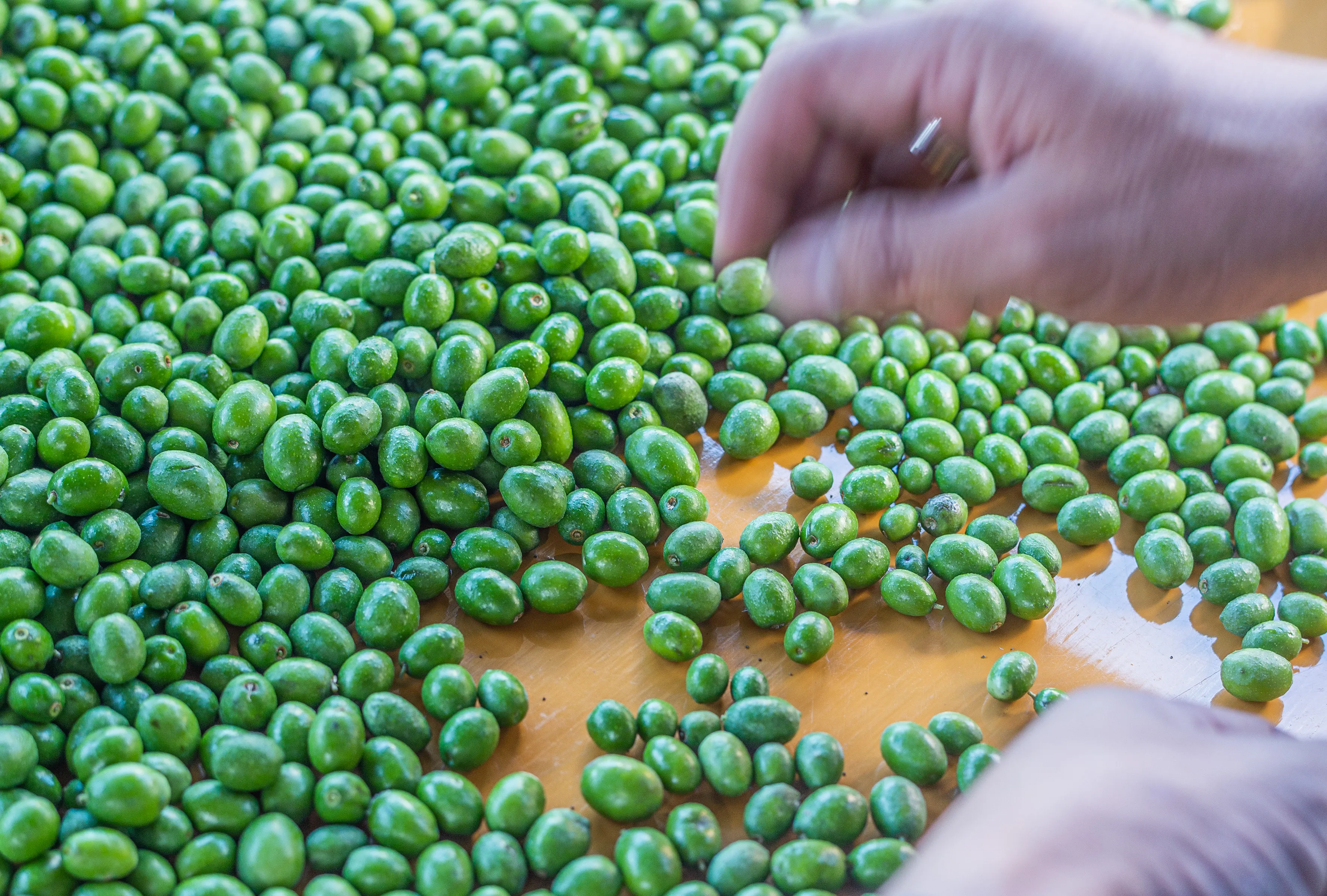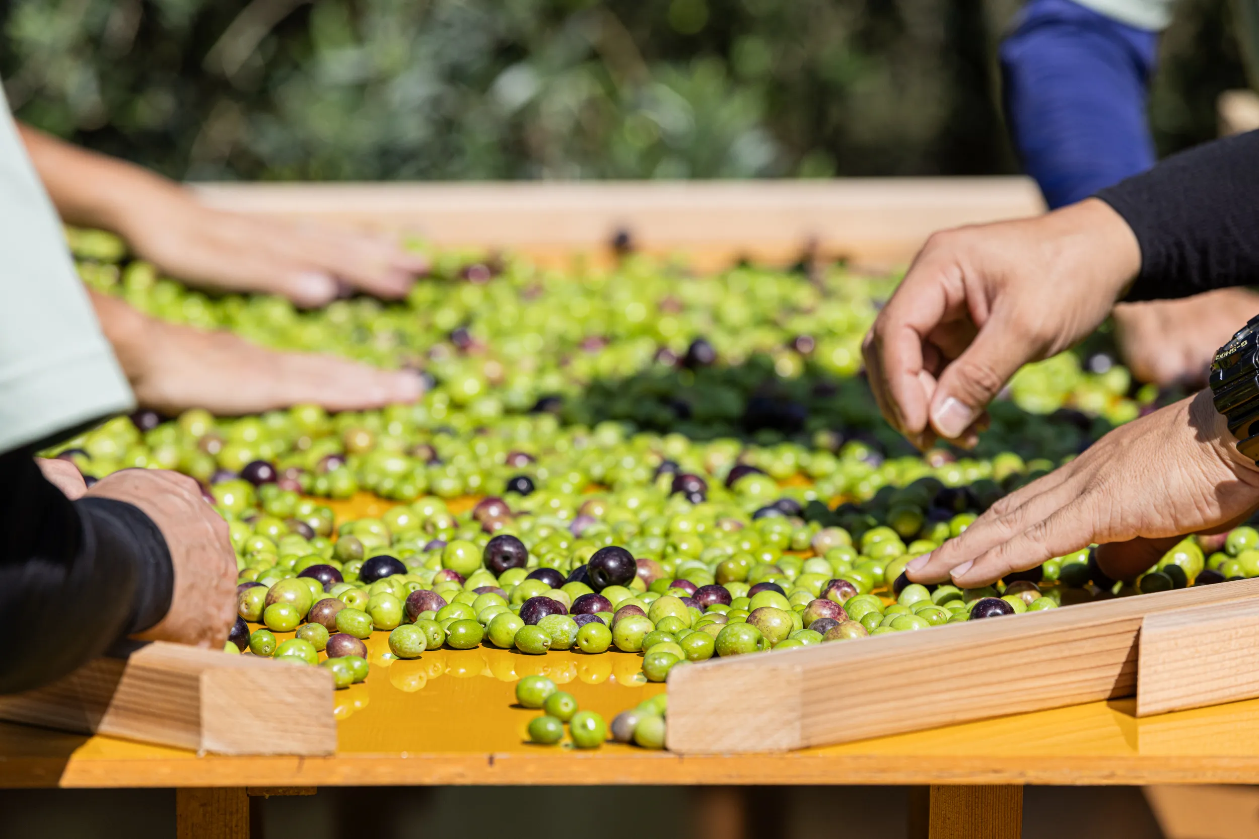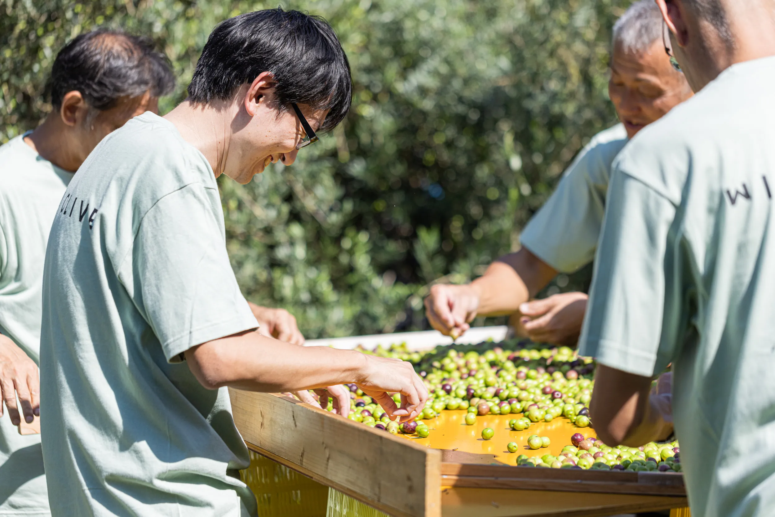 人の手で一つずつ丁寧に高品質のオリーブオイルをつくるためには、傷などの無い良質の実を選別することが大切です。この作業は機械では難しく、人の手で一つずつ丁寧に行う必要があります。この一手間を惜しまず、真剣に行うことが美味しいオリーブオイルを造るのにとても重要となります。