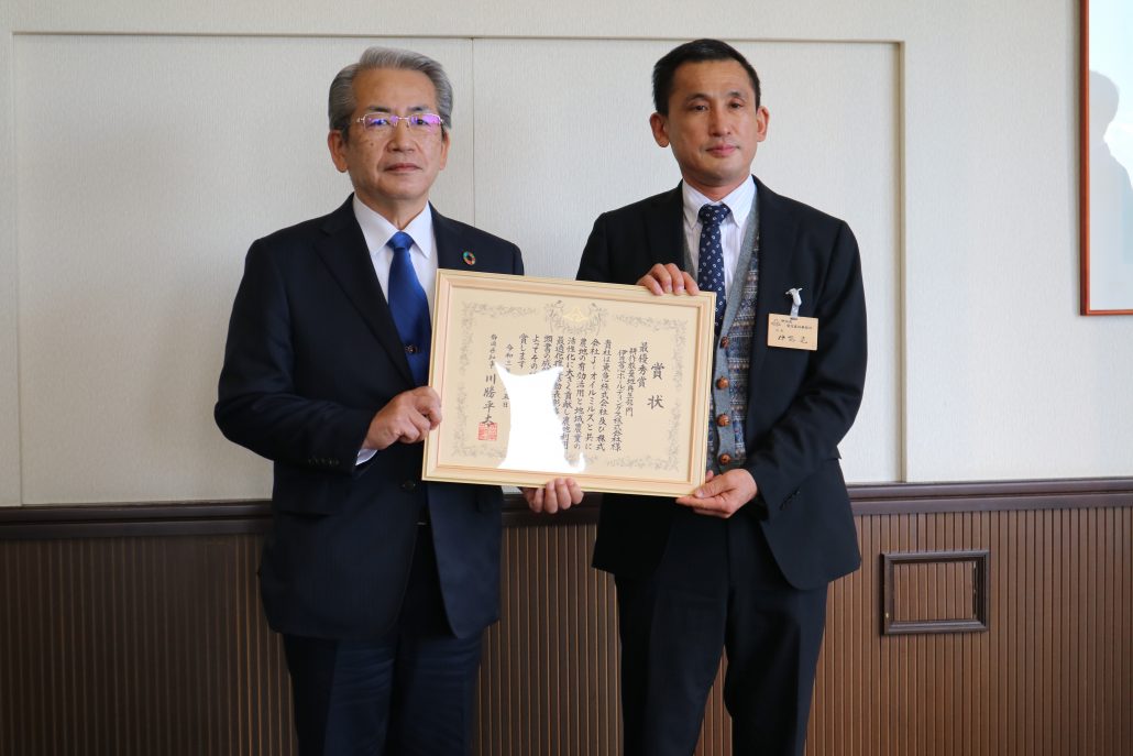 表彰式では、静岡県賀茂農林事務所の伊藤所長より伊豆急ホールディングス株式会社の小林社長に賞状が授与され、伊藤所長からお祝いの言葉を頂戴し、これを受けて小林社長は今後の抱負を述べました。