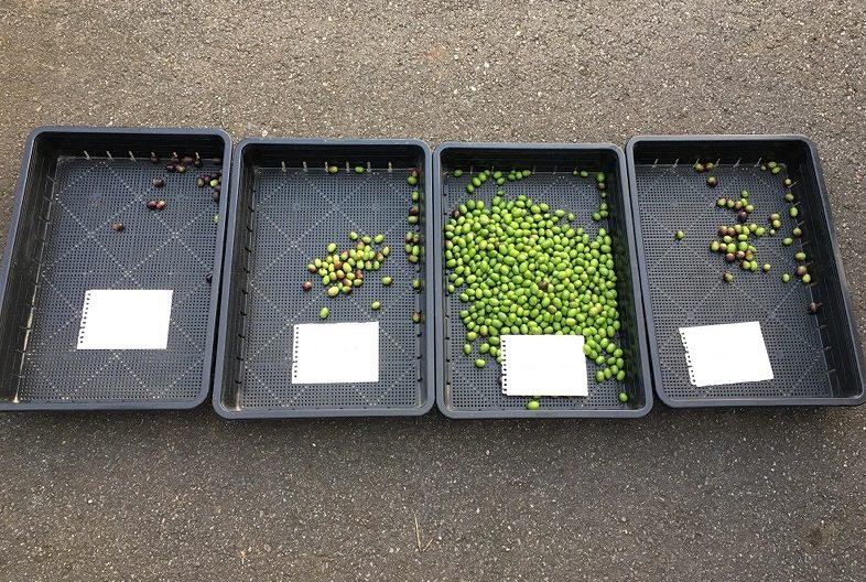 完熟前のグリーンオリーブと少量の紫がかったオリーブ。