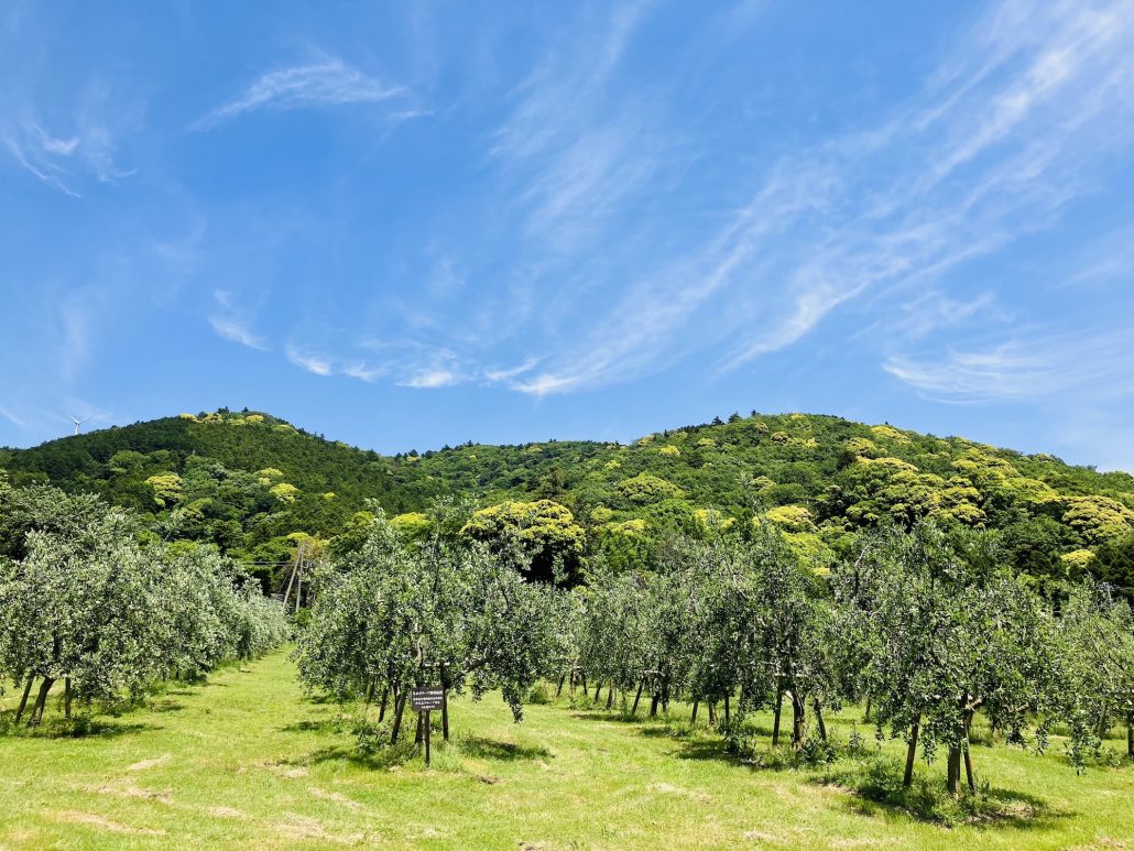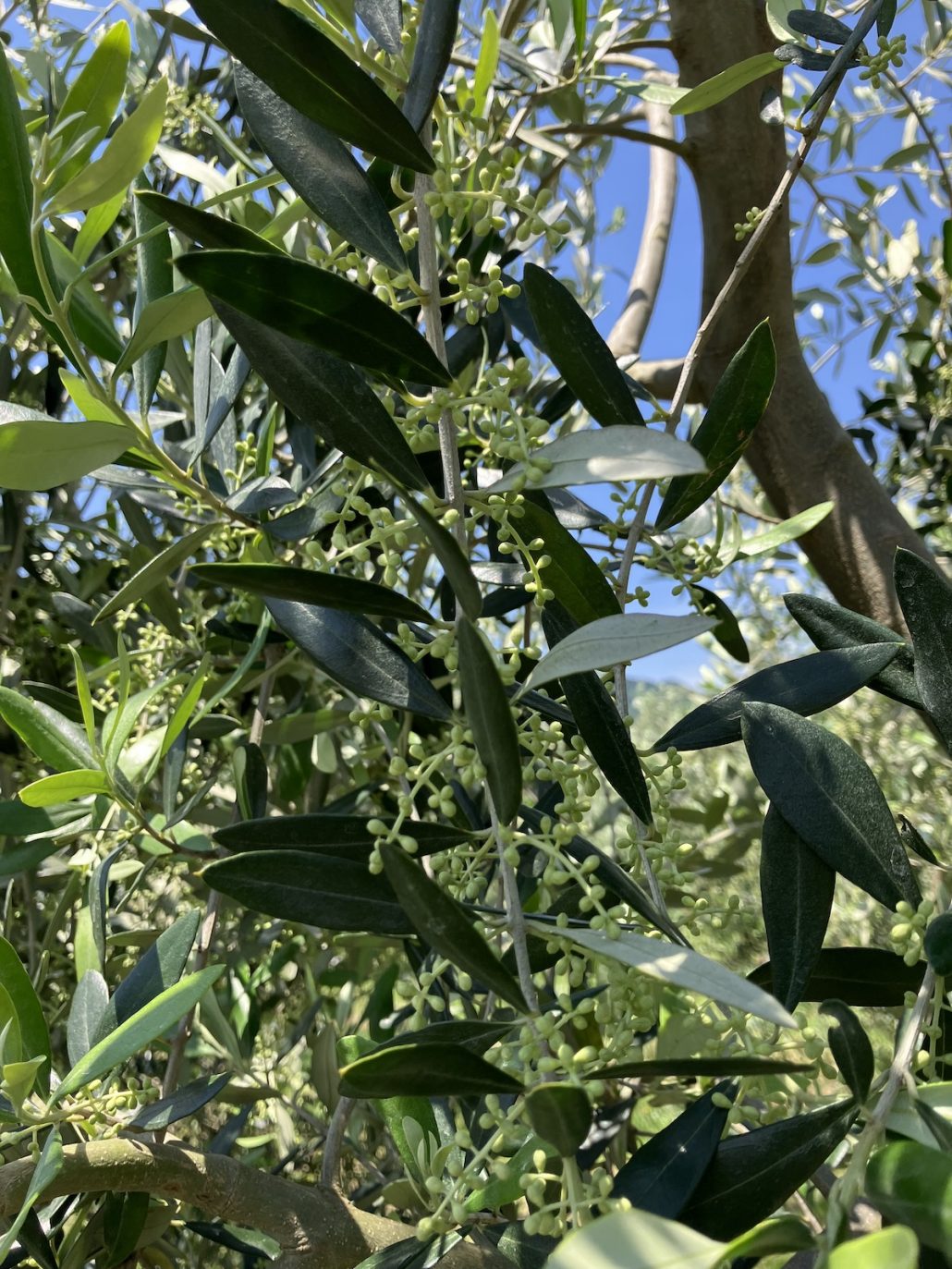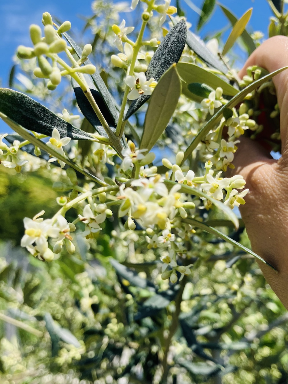 青空に恵まれた今日、片瀬圃場でオリーブの開花を確認しました!!