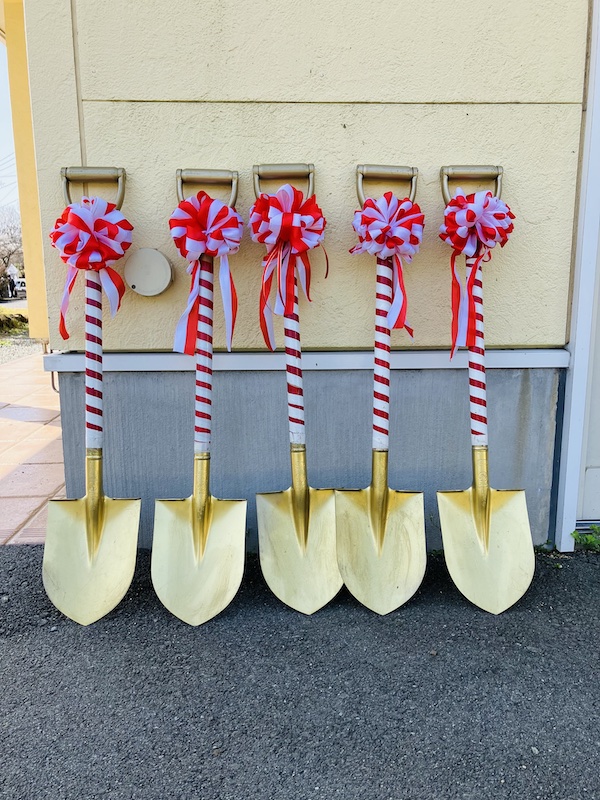 記念植樹に活躍してくれたスコップ、スタッフがお祝いの気持ちを込めて金色に塗ったお手製です♪