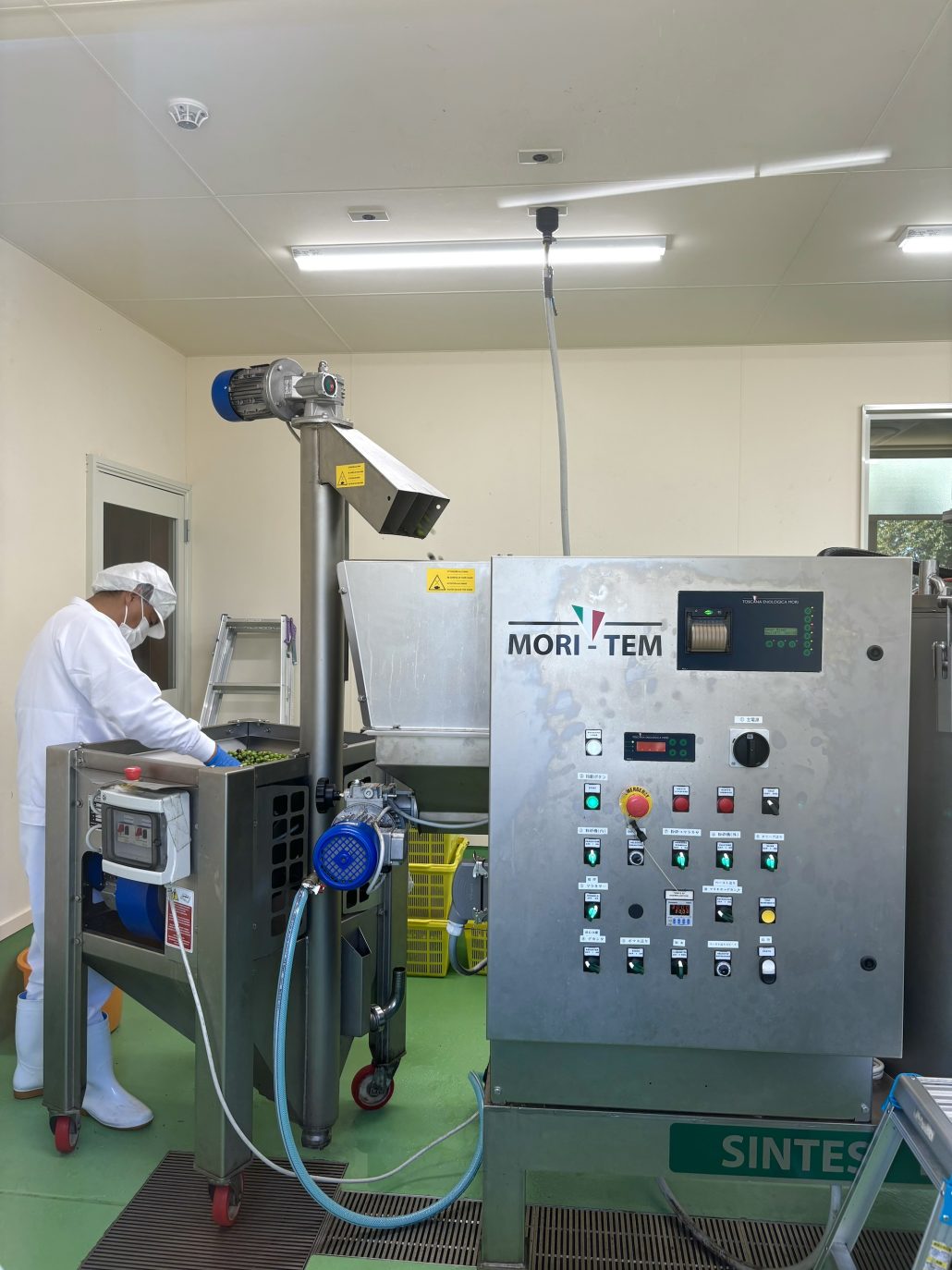 オリーブの洗浄→粉砕→ペーストの練り込み→搾油(遠心分離)とイタリア製の搾油機で行われます。