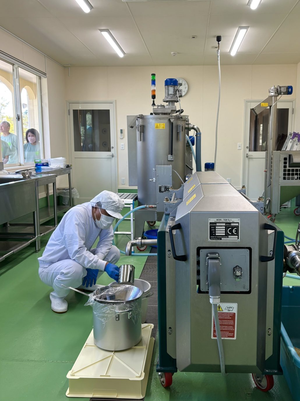 ランチタイムの間、先ほど収穫したオリーブの搾油が行われました。