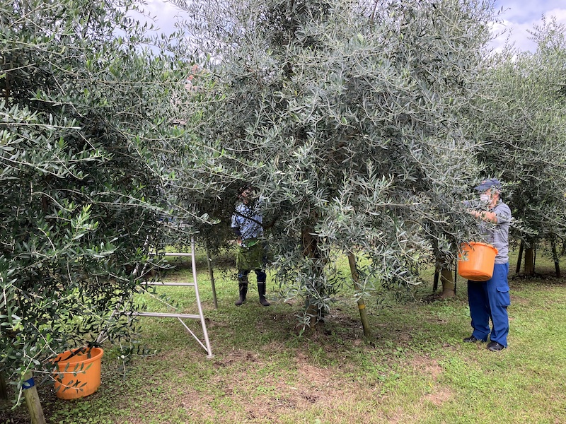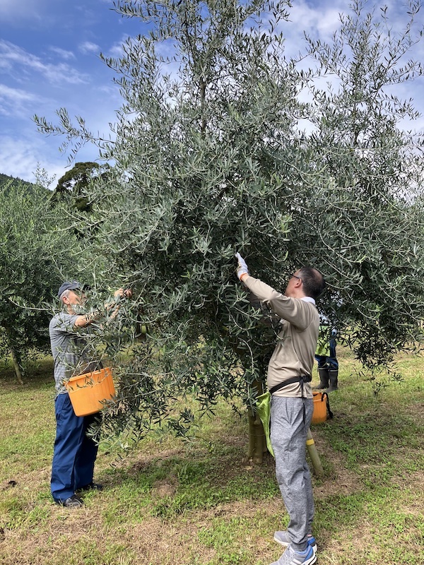 日が傾き収穫作業を終えて、このあと搾油所で選果作業が続きます。