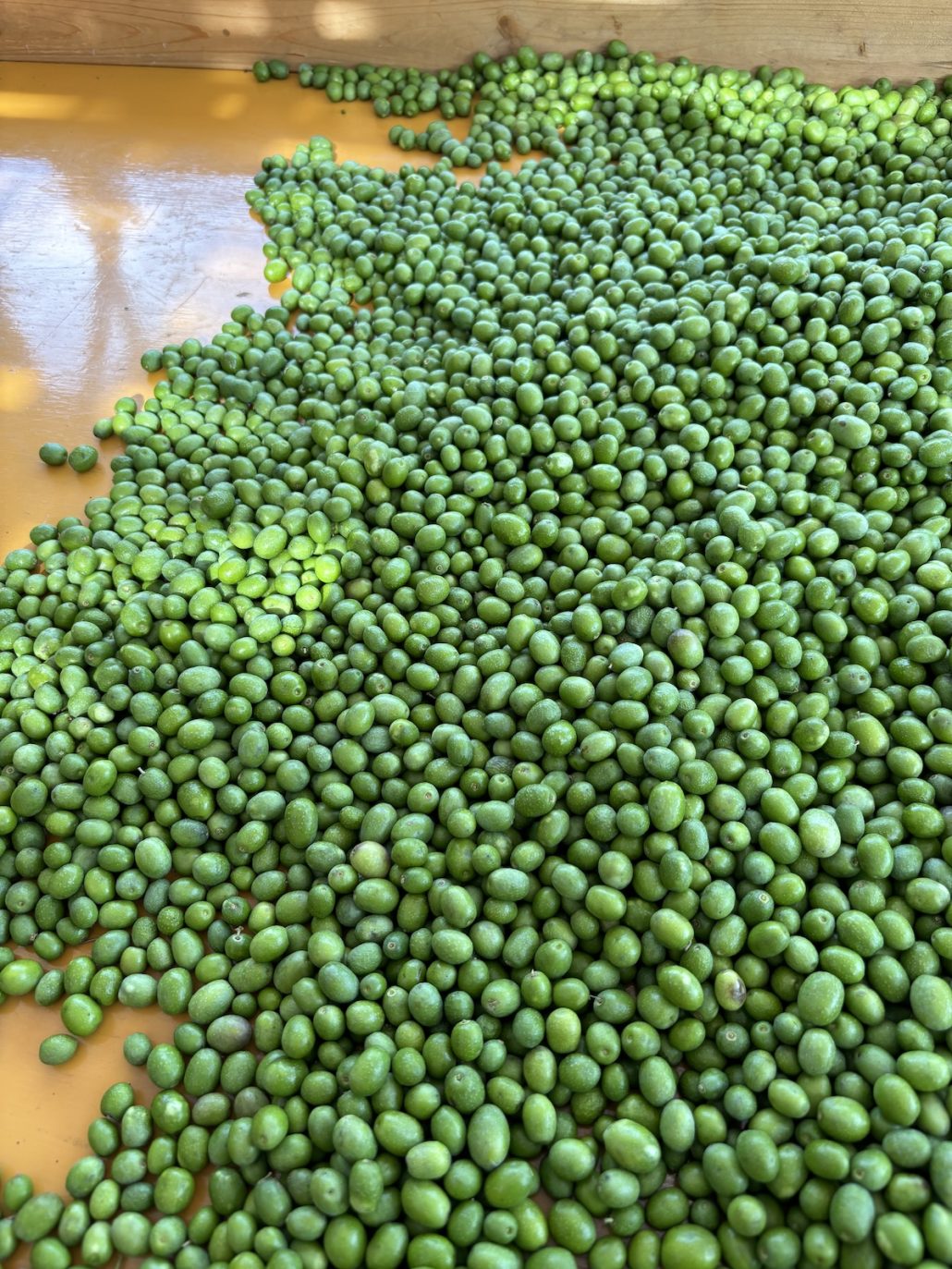 オリーブと同じ色をしているカメムシも混じっていたり、丁寧な選果作業は時間がかかります。