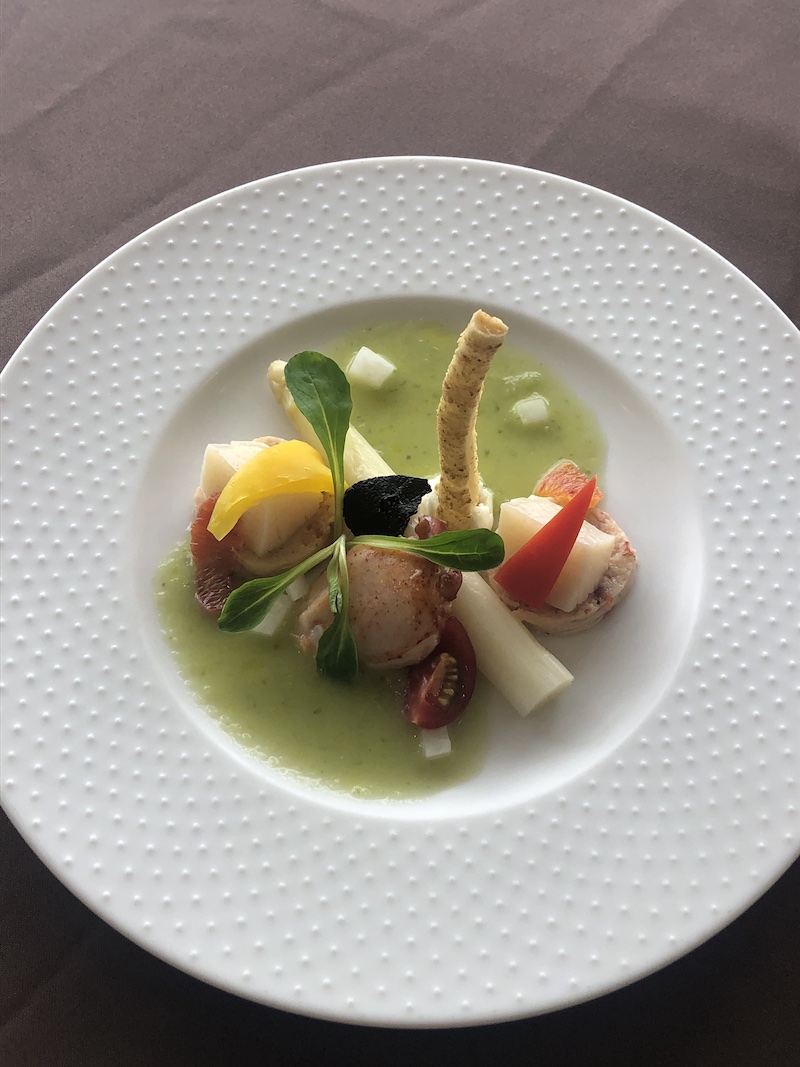 ②「オマール海老、帆立貝とホワイトアスパラのサラダ 緑のガスパチョ」