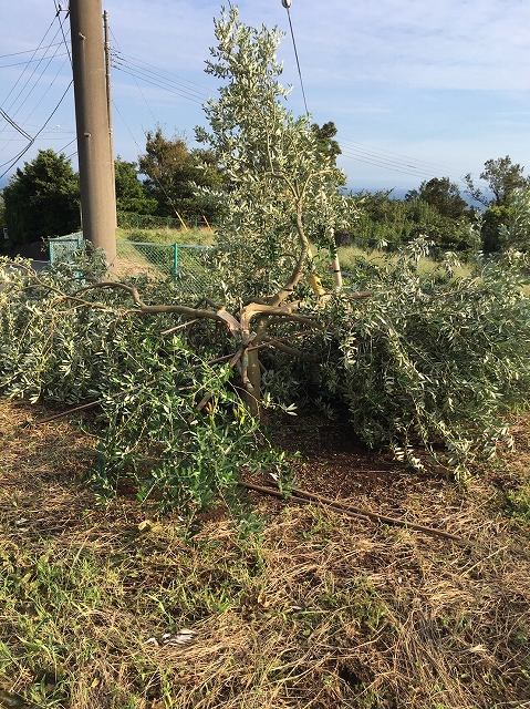 先日の台風の影響でたくさんのオリーブが倒れ、収穫予定だった実もかなり落果してしまいました。
