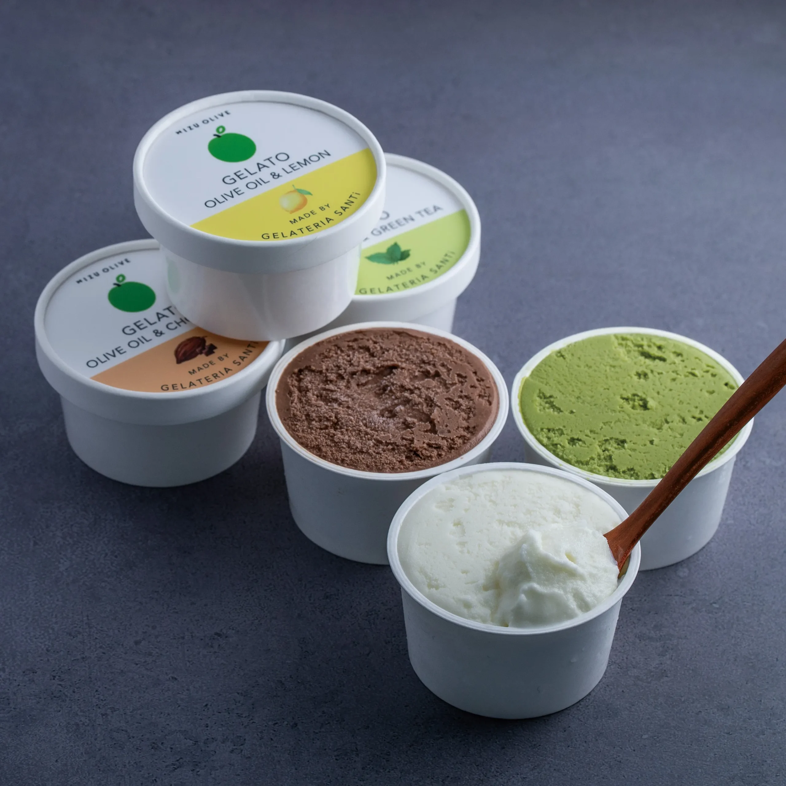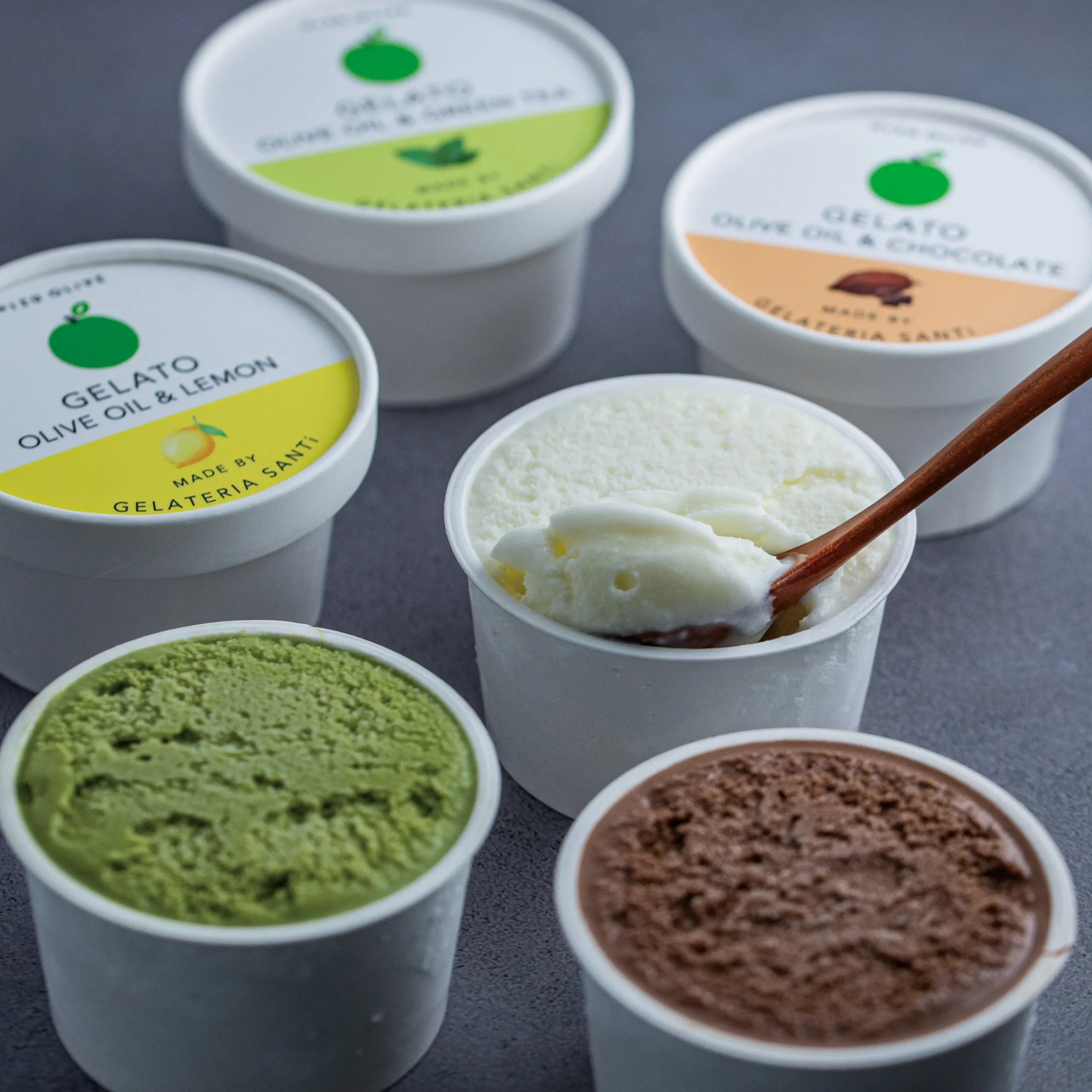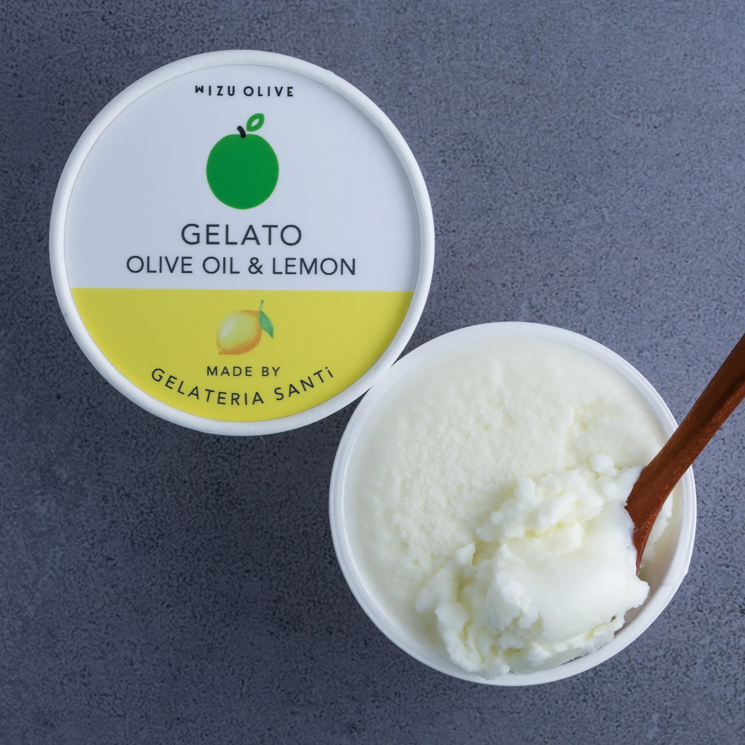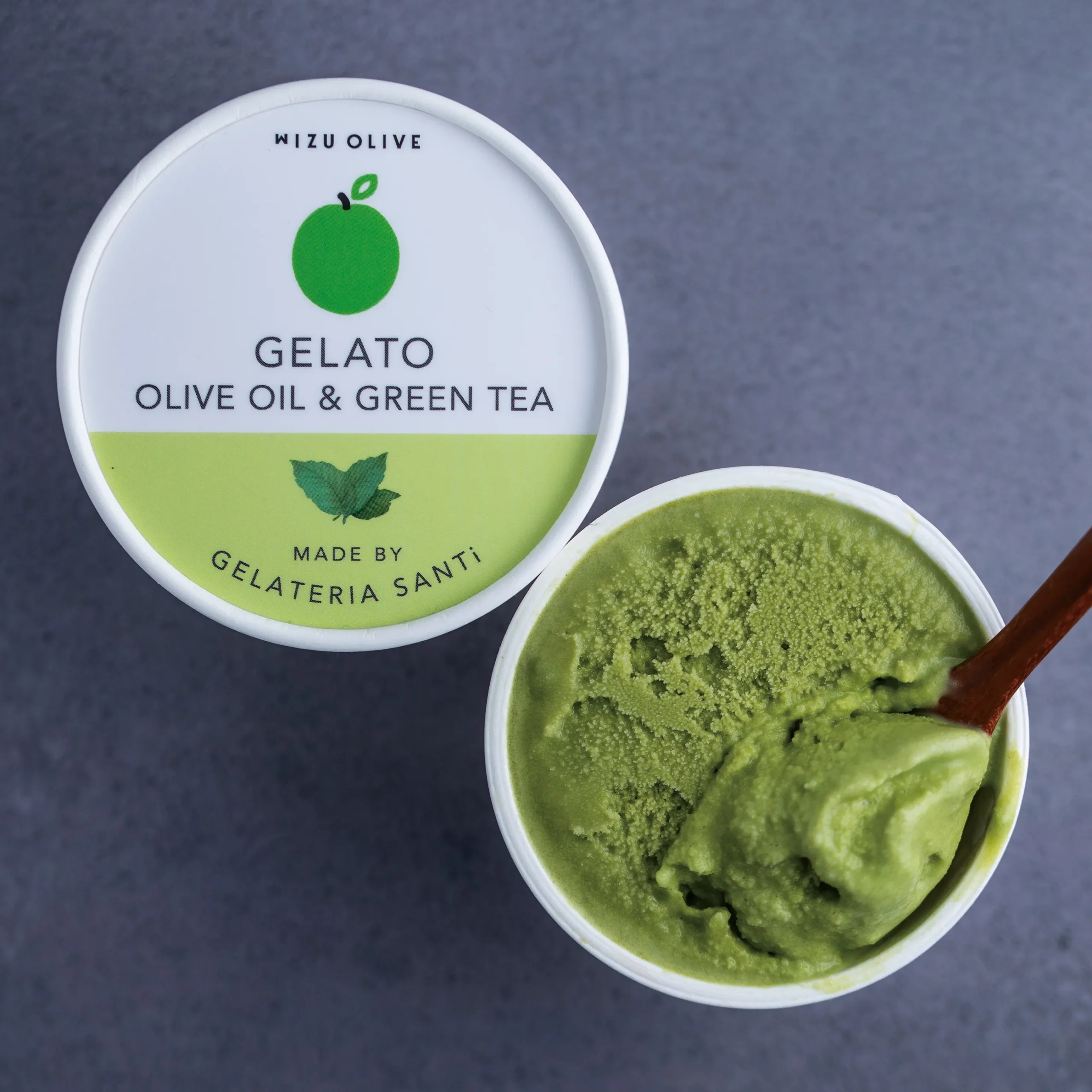 「オリーブオイル&レモン」「オリーブオイル&ぐり茶」「オリーブオイル&チョコレート」の3種類をご用意しています。オリーブオイルの風味がそのまま生きていて、食べているとオリーブオイルの持つほんのり辛味や苦味も感じられます(ポリフェノール由来です)。This is a collaboration product with GELLATERIA SANTi (Kamakura), which makes natural gelato without artificial additives using seasonal ingredients and simple recipes that bring out the best in them.