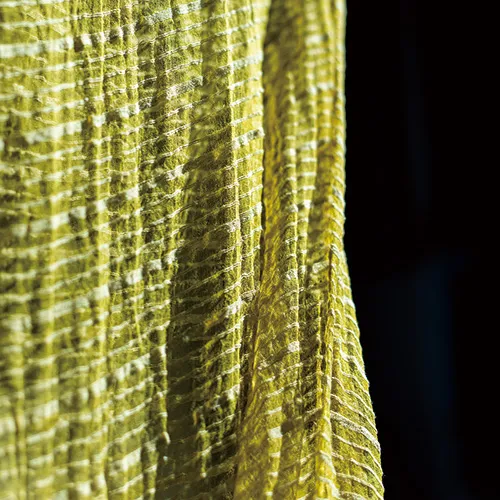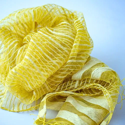 自社オリーブの葉を使用し手染めしたオリジナルストール。ツヤ感のある鮮やかな黄色に染まった上質シルク(インド産100%)のストールは、伊豆在住の染色家・三橋由美子氏の手によるもの。This original stole is hand-dyed using olive leaves from the company's own farm. The stole is made of high-quality silk (100% from India) dyed a lustrous, vibrant yellow by Yumiko Mitsuhashi, a dyer based in Izu.